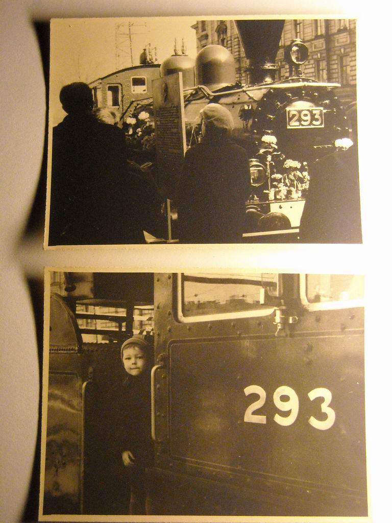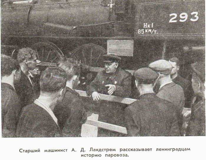 В забавной книжке 1957 г. "Рассказ о празднике"(о 250-летии Ленинграда) подробно описана история с паровозом и помещено фото его времменой стоянки(2 фото выложу позже).На паровозе 293 вместе с Гуго Ялавой работали Адольф Линдстрем и Вльдемар Виролайнен. Последний "только в 1947 году случайно напал на след паровоза №293...Он узнал,что паровоз работает в железнодоржном округе Тампере.И вот в канун 250-летия Ленинграда паровоз прибыл на пограничную станцию Лужайка,а через несколько дней тысячи трудящихся встречали его на Финляндском вокзале" Вел локомотив Адольф Данилович Линдстрем.Паровоз был установлен на Нейшлотском переулке.