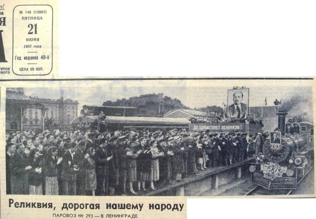Ещё из "Ленправды" за 21 июня 1957 г. о ленинском паровозе (тема начата на ветке "Переход через жд в створе Смолячкова-Чугунная", но более близка к данной ветке). Интересен фон старого вокзала