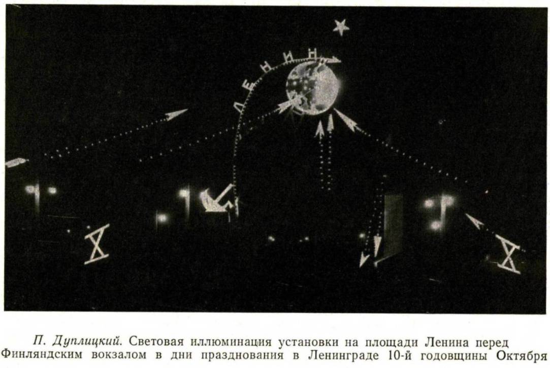 ..."На площади у Ф.В. была сооружена легкая ажурная конструкция. Она объединяла в единый декоративный комплекс бутафорный башенный кран с сияющим земным шаром и усеченный обелиск, украшенный эмблемой "Серп и Молот" с цифрой "Х". Особенно эффектно это выглядело в вечерние часы: в темноте сверкал серебряный глобус с контурами границ СССР, ярко светились слова "Везде, всегда, безраздельно с нами - Ленин", пламенела, словно парящая в вышине, алая звезда, искрились стрелы молний из цепей электролампочек..."