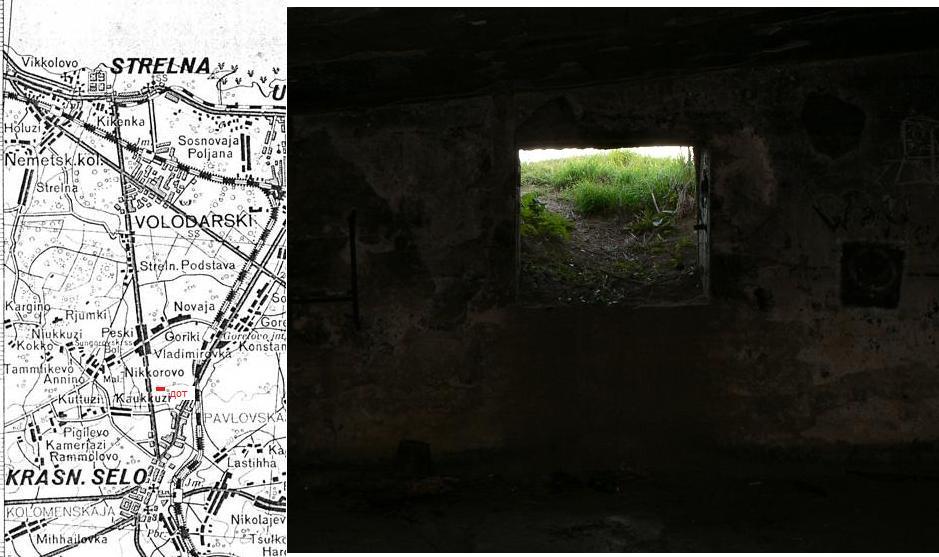 Сооружение неслабых размеров с тонкими стенами, кое-где кирпичными. Амбразуры находятся на высоте доброго метра от пола. Два помещения высотой метра 2 от пола до потолка. Это может быть КП, НП, но не дот. Доты в Красном селе совсем в другом месте. А про сооружение мне рассказывали, что это помещение охраны аэродрома, он там рядом. Про изрешеченность пулями - надо смотреть, у нас и знаки дорожные кое-где прострелены, не с войны же висят. А лента и штык-да запросто, бои же там везде были. Я например у соседа на даче откопал гранату без запала и штык опять же. Хотя - Пупышево, казалось бы, откуда там?