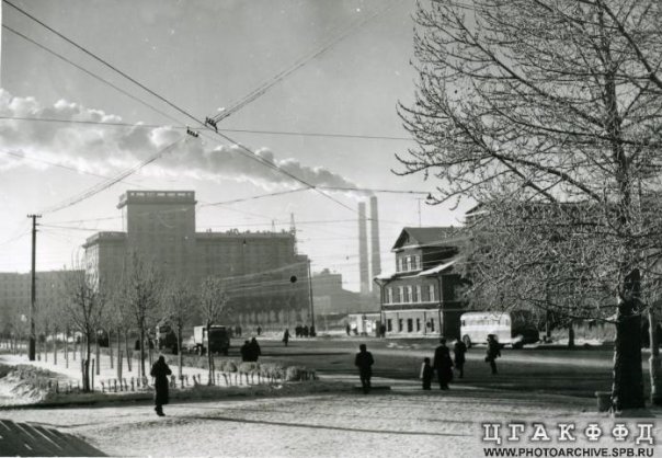 Место - у бывшего трамвайного кольца "Кировский завод" на нынешней Комсомольской площади, снято на северо-запад.