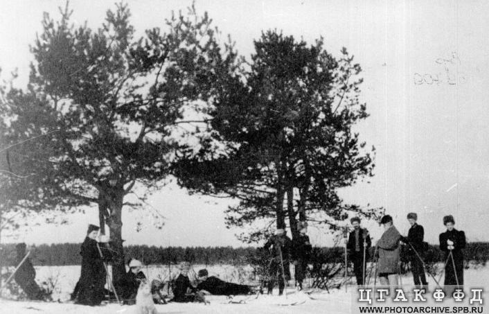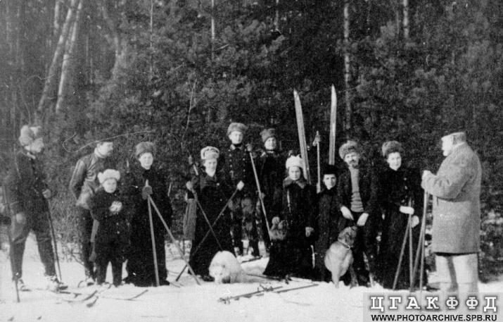 И.П.Павлов (1-й справа) среди семьи и друзей на лыжной прогулке в Удельной. 1-я справа жена И.П.Павлова Серафима Васильевна Павлова, сын В.И.Павлов. Сзади Виктор и Всеволод Павловы, 2-й слева В.А.Догель.