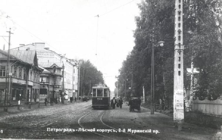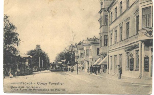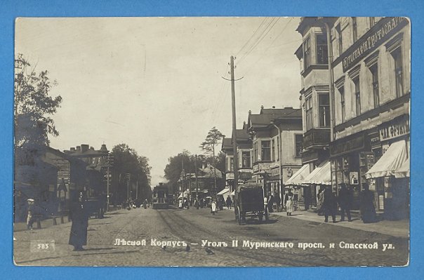 Нет – это вид по 2-му Муринскому пр. примерно от нынешней ул. Орбели в сторону Институтского пр. Кстати, кирпичный дом на правой стороне существует до сих пор. Насчет "поворота" поезда паровой конки – это вероятно съезд на боковой путь разъезда однопутной линии.
