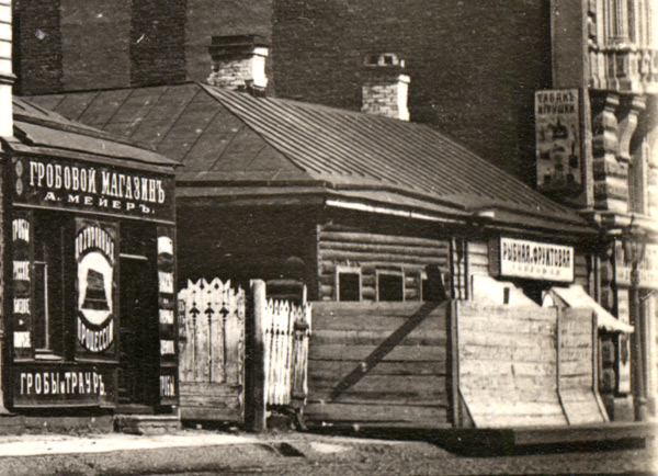 Совершенно замечательный второй снимок: резная калитка и вывеска "Гробовой магазин"