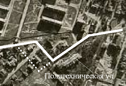 А вообще, в данном конкретном случае нужно быть проще. Есть АФС 1942 г., где прекрасно видны трассы прилегающих улиц, точка пересечения пр. Раевского и Политехнической, здание Еленинской больницы, 105 корпус Академгородка, красное здание служащих Политеха. И, что очень важно, участок Политехнической улицы, пролегающий вдоль ограды Еленинской больницы! Который полностью повторяет "историческую" трассу.