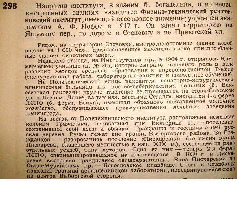 "В начале существования Политехнического Института вся окружающая местность представляла сосновые леса на сухой песчаной почве, покрытой хвоей и лишайниками, а дорога в Институт была вся окаймлена хорошенькими дачками. В настоящее время значительная часть леса вырублена, дачи же пошли на дрова во время холодов 1919— 1920 г.г. Против Политехнического Института находится приют и Детская Городская Больница имени Калинина, занимающая громадное пространство по направлению к Удельной. За этими учреждениями на перекрестке дорог, где идут уже поля и начинается проспект Бенуа, находится могила Карла и Эмилии, двух любовников, покончивших жизнь самоубийством. Это—излюбленное место для прогулок местной молодежи, и действительно вечером оттуда открывается недурной вид на заходящее солнце и окрестные поля. Недалеко отсюда, на незастроенных местах Яшумова пер., можно хорошо видеть три древних береговых вала. В конце проспекта Бенуа находится образцовая Лесная ферма, бывшая Бенуа, а теперь государственная."