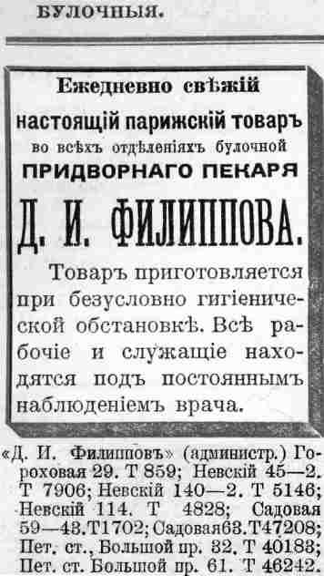 Вообще "Филиппов" – это изначально московская фирма. В Петербурге "головная", самая шикарная булочная Филиппова с полным ассортиментом была на Старо-Невском на скругленном остром углу между Дегтярной ул. и Калашниковским пр. Вторая по значимости, но ближе к фешенебельным центральным кварталам – на углу Невского и Караванной (где и сейчас булочная), какое-то время вроде бы была филипповская булочная на Невском напротив Гостиного Двора, где сейчас ресторан "Абрикосов" (это тоже исторический бренд!).