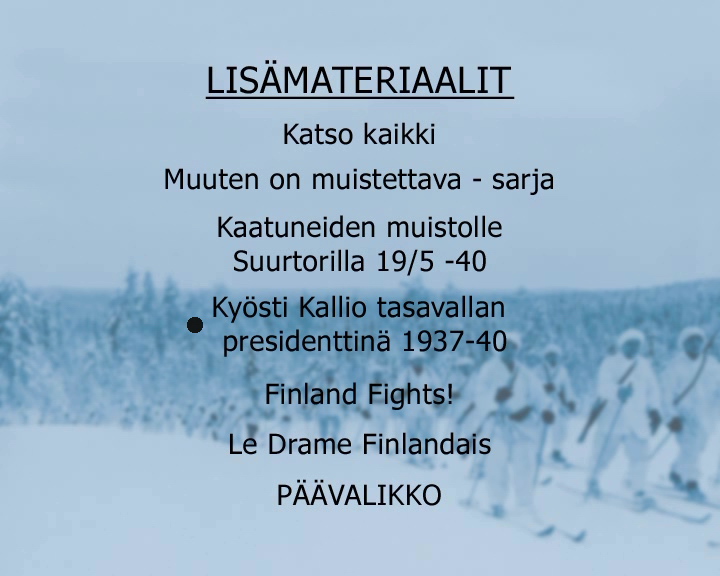 Ксения, спасибо! Я через некоторое время понял, что вопрос мой дурацкий. Я почему-то подумал, что фильм Finland Fights выложен где-то в другом месте, а оказалось, что это один из фильмов на 2-м диске Talvisodan Katsaukset. Чтобы больше не было подобных вопросов выкладываю содержание обоих дисков в виде скриншотов меню.