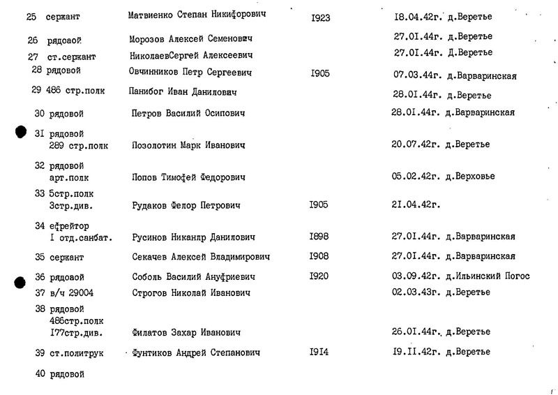 Боюсь, что это не то Веретье. Это имеется в виду Веретье к северу от г. Любань, рядом с д. Бородулино. Я писал об этом выше и даже приводил фрагмент карты. Также я выкладывал документы из ОБД Мемориал по захоронению в Любани, куда многих перенесли из того Веретья. Если взять донесения 177 сд. за январь 1944 г., то многие фамилии совпадают: Панибог И.Д., Будаев И.Я., Филатов З.И., Морозов А.С. и другие. Я ведь тогда тоже ошибся, приняв Веретье у Любани за искомое. Так что вопрос о том, кто захоронен в ур. Веретье возле деревень Ёглино и Дубовик остается пока открытым.