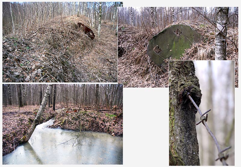 Местность насыщена останками полевой фортификации и нашпигована ржавым железом. На заболоченной местности трудно отрыть окоп, потому приходилось сооружать своеобразные стрелковые валы. На снимках вверху - предположительно немецкие валы. Внизу слева - окопы, блиндажи, землянки - всё затоплено. Колючки много - как старой так и новой.