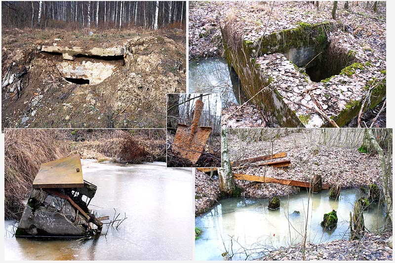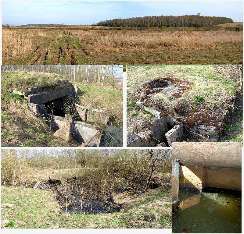 Наверху - панорама с локатором и Пулковой горой на горизонте. Далее по порядку: капонир для техники 1950-х гг, немецкий тобрук (а м.б. - наш советский рингштадт, т.к. не было у них времени на постройку такую, да и развёрнут он мордою на юг), позиция для зенитки из бетонных плит 1950-х предположительно годов (тут таких 6 штук) и далее затопленные внутренности вышеописанного рингштадта/тобрука.