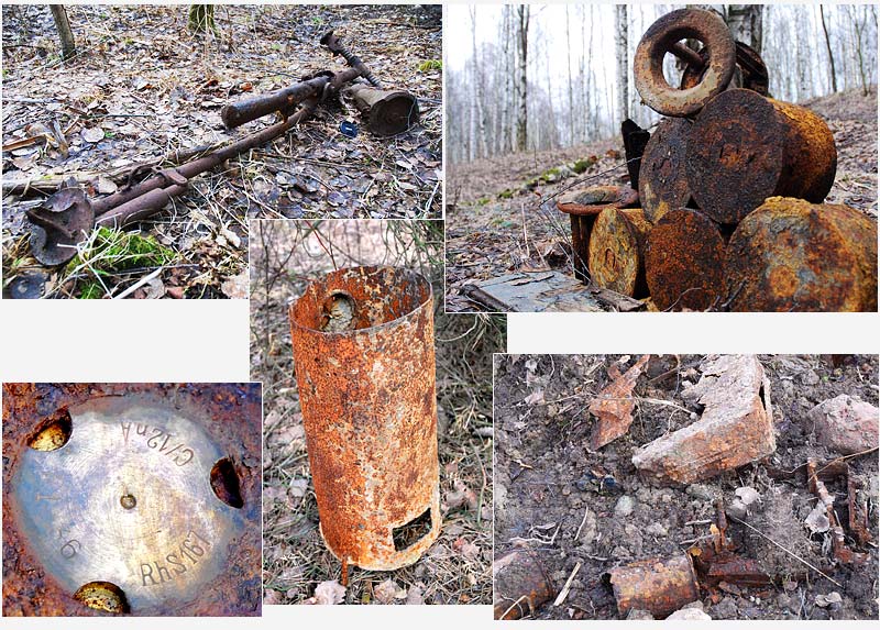 Грунт для сохранения артефактов тут явно неблагоприятный, всё ржавое и рассыпается в прах не то что в руках, а даже при пристальном взгляде на предмет. Вверху слева - миномётная тренога, справа - выстрелы к немецкой 155мм гаубице. Далее внизу - капсюль выстрела, печка из блиндажа и типический вид берега реки Койровки, подмытый весенним паводком.
