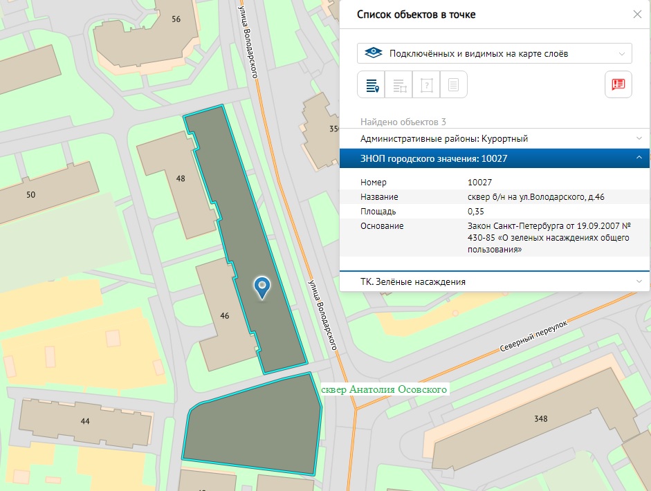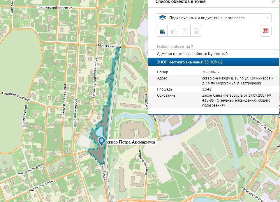 сквер Александровские Ворота, сквер Алые Паруса, сквер Анатолия Осовского (г. Сестрорецк), сквер Архитектора Аплаксина, бульвар Архитектора Чевакинского, сквер Виктора Чистякова, Гарновский сквер, сквер Генерала Броневицкого, сквер Графини Паниной, Ивовый сквер, сквер Ключ Времени, бульвар Ленинградской Победы, сквер Лоцмана Трофимова, сквер Людмилы Беловой, сквер Николая Лихачёва, сквер Павла Филонова, сквер Петра Авенариуса (г. Сестрорецк), сквер Петра Плетнёва, Пороховской сад, Слободской сад