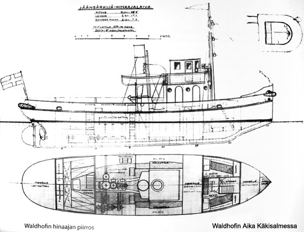 В книге "Waldhofin aika Käkisalmessa" (Времена Вальдхофа в Кякисалми) есть общий вид буксира "Waldhof 1" и страница текста о нём. Построен в 1922 г, назван "Vartio 2" , размерения 21,0 х 5,32 х 2,66 / 65 brt / 16 nt. Был в Выборге, с 1930 г в Кякисалми, назван "Waldhof 1" . В базе его не нашёл (возможно из-за того , что завод принадлежал немцам). Может как-то поможет опознанию.
