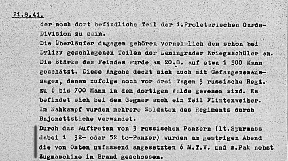 Из-за появления 3 русских танков (согласно ширине колеи 1 танк весом 32 или 52 тонны), 6 бронетранспортеров и тяжелый ПАК вместе с тягачом, которые были посланы в охват с востока, были сожжены прошлым вечером.