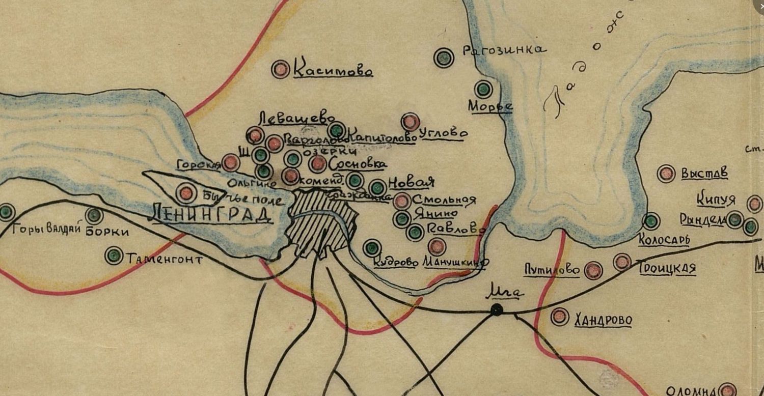 "Причем для этого пришлось вспомнить опыт финской войны, когда в качестве взлетно-посадочных полос использовались замерзшие озера. Всего в итоге на окруженной немцами территории функционировало 20 аэродромов: Комендантский, Сосновка, Гражданка, Смольное, Левашово, Парголово, Озерки (Шувалово) (?), Капитолово, Кудрово, Касимово, Горская, Янино, Манушкино, Углово, Новая, Кавголовское озеро (зимой 1941-1942 годов), Рогозинка, Морье, Бычье Поле (Кронштадт), Лавансаари (один из внешних островов Финского залива). И еще три аэродрома было оборудовано на Ораниенбаумском плацдарме: в Тамегонте, в Борках и в Горе Валдай.".