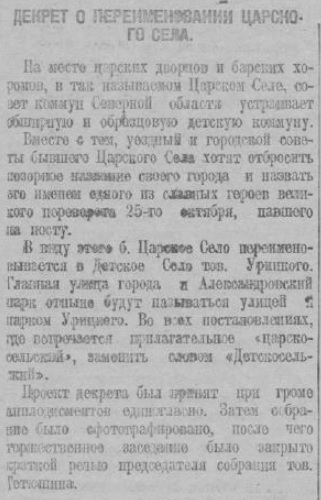 1918 год. 20 ноября - Царское Село переименовано в Детское Село имени товарища Урицкого