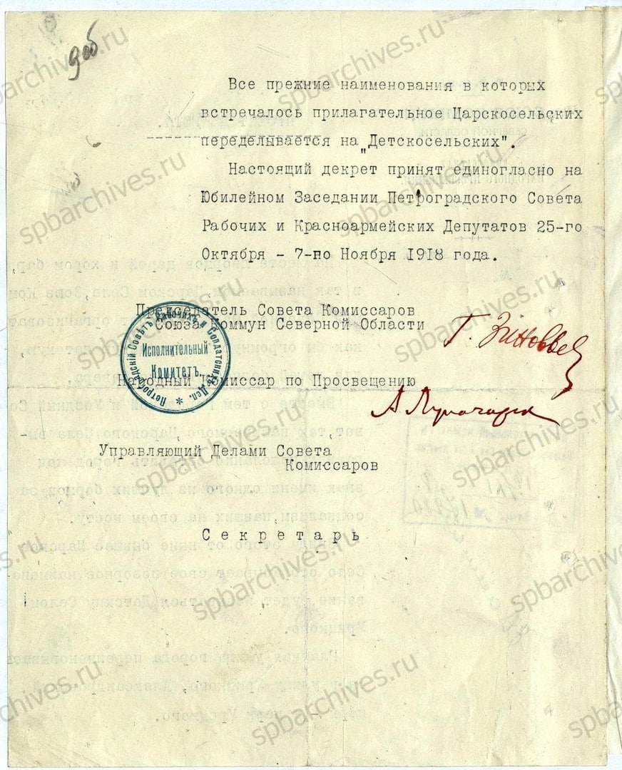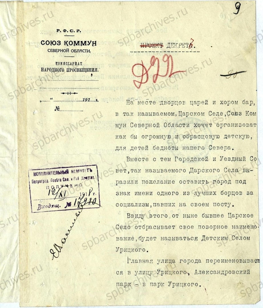 Собственно, проект декрета о переименовании Царского Села в Детское Село Урицкого: