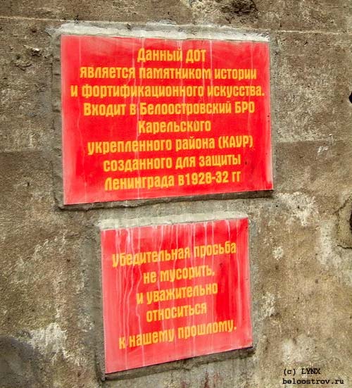 | Цитата: | Поэтому в качестве первого этапа предлагаю произвести расчистку дотов и установить на них информационные таблички. Под расчисткой понимается вырубка кустов непосредственно у дота, очистка сооружения от мусора, установка информационной таблички с кратким описанием объекта. Красить ничего НЕ НАДО!. Небольшой опыт показал, что даже такие простые, не требующие больших затрат, меры эффективно способствуют формированию самосознания окрестного населения, развития у него чувства гордости за свою историю.
