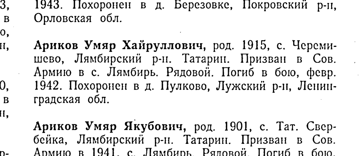 Здравствуйте. Очень нужна помощь в поисках места захоронения моего прадеда Арикова Умяра Хайрулловича, 1915 года рождения. Моя бабушка до настоящего времени считала своего отца пропавшим без вести, однако благодаря "ОБД Мемориал" нам стало известно, что он погиб в феврале 1942 г. и похоронен в п.Пулково Лужского района Ленинградской области.
