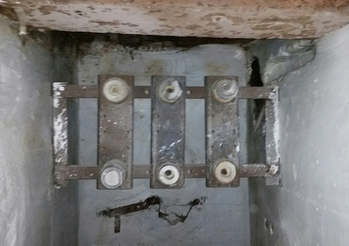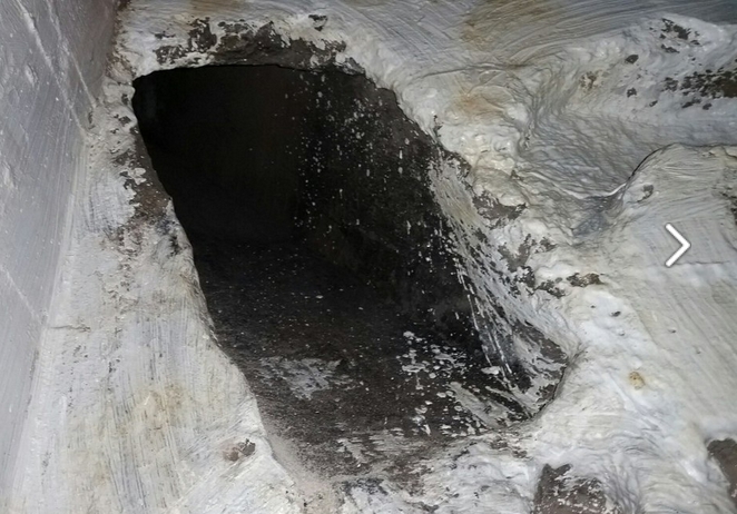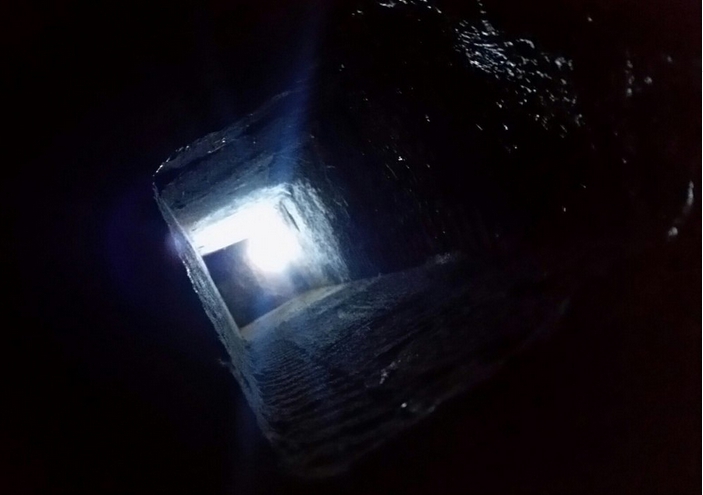 В в помещении под сквозняком, где расположены высоковольтные изоляторы, обнаружился квадратного сечения косовосходящий канал, а в его конце... в щелочке пробивается свет. В конце концов нашли его выход. Правее входа в сквозняк, на улице, сантиметров 20-30 выше грунта, обнаружилась бетонная заплатка. Вскрыли ее, а за ней - вход в этот канал.