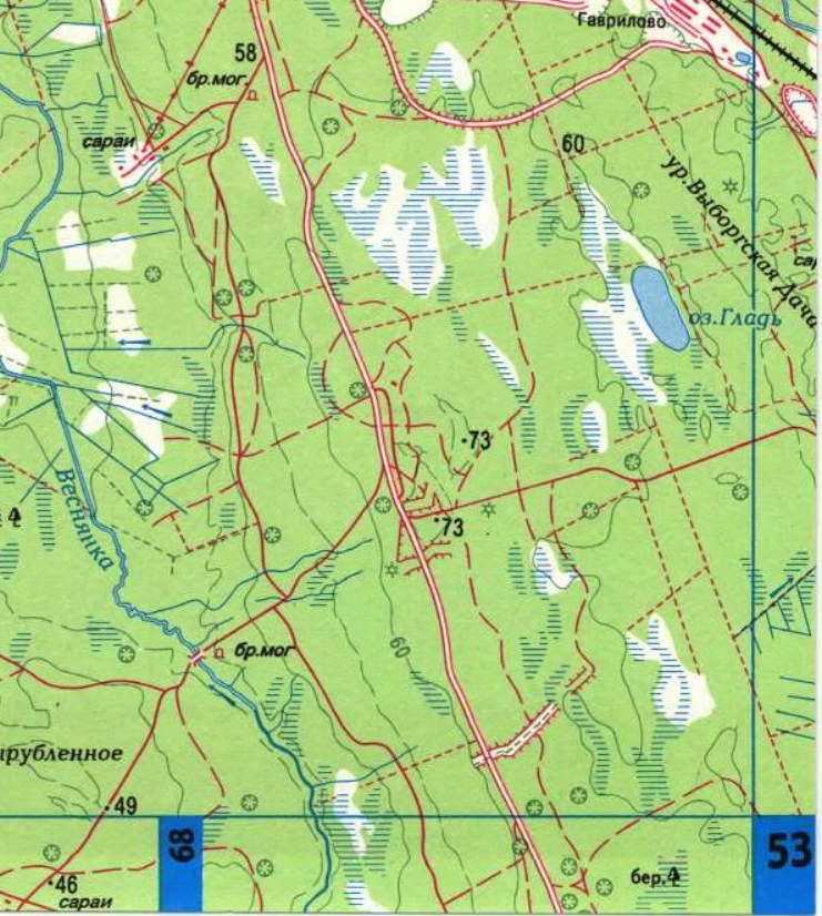 На многих картах указана братская могила возле моста через речку Веснянка. На сайте http://lenww2.ru/index.php/region01/area05 эта могила не значится, а, например, братская могила на этой карте вверху в квадрате 58 указана (05124 п. Гаврилово, 2,5 км южнее, братская могила № 63).