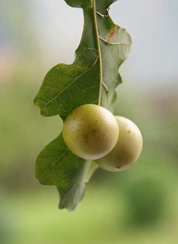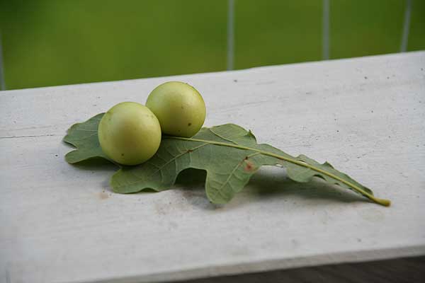 Вот такие "ягоды" выросли у нас на даче на нескольких дубах. Растут просто на листьях. Внутри у них мякоть того же цвета, что и "кожура", в центре маленькая косточка. На вкус никто не решился попробовать )