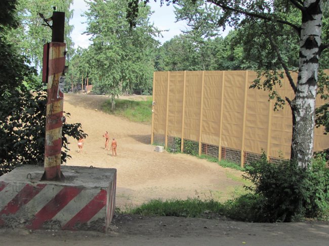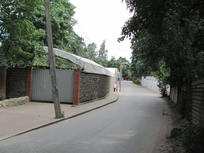 Однако архитекторы этой фазенды вдохновлялись красотой чего-то ужасно оборонительного. С Эриванской улицы и глухая гранитная стена имеется, и брезента с полсотни метров и сеть маскировочная. Очень не хватает колючей проволоки и дозорных вышек по углам. Были и шлагбаумы, которые перегораживали улицу с двух концов, но, слава Богу, добрые люди снесли. И ведь это все в городской рекреационной зоне, а не на каком-нибудь далеком озере, которого никто и в глаза не видел.