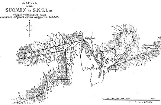 У подобных аппендиксов, коих на свете тысячи, объяснение почти всегда одно, вернее два: рельеф местности и главный -- древние родоплеменные связи. В данном случае, глядя и на современные карты, нетрудно подметить, что к западу от линии бывшей границы, названия -- преймущественно финские, а к востоку -- карельские.