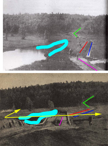 Красное - дорога, вдоль канавы (синяя), зеленым - характерный изгиб дороги на подъеме. Фиолетовое: был мост, затем гать. Голубеньким очень похожий разлив воды.