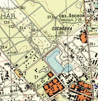 А вот еще топокарта этого места(до массовой застройки,1958-60 гг.). С военных времен в этой части Сосновки изменений мало: