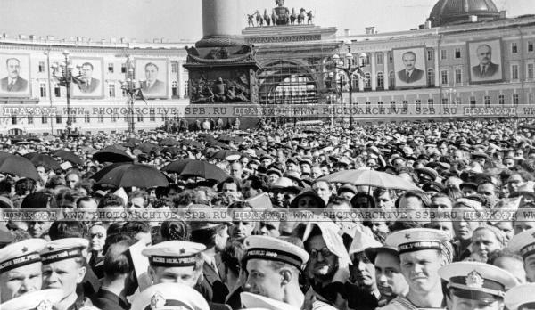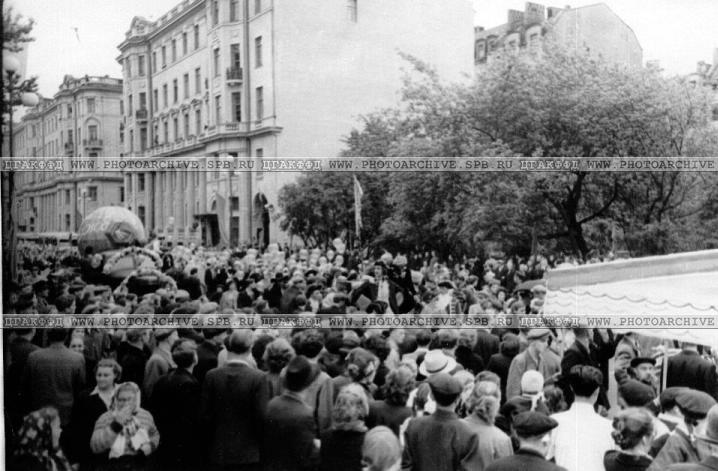 Но вернёмся к 23 мая 1957 года, за месяц до того. Это не демонстрация, а митинг. Не более 40-50 тысяч; колонн, которые потом пошли бы с Невского, с Дзержинского и с Дворцового моста, нет. (Для Буквоед’а — ранее анонсированное фото с ещё не свергнутыми Кагановичем и Молотовым: