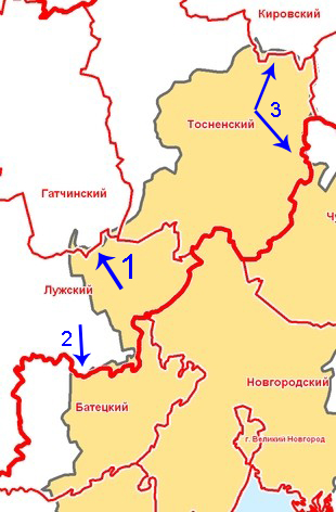 (Здесь серым — старая граница губерний, красным тонким — современные границы районов, красным жирным — современная граница областей.)