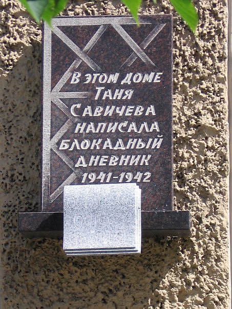 Надпись: "В этом доме Таня Савичева написала блокадный дневник 1941-1942" и воспроизведенный в камне лист дневника: "Осталась одна. Таня".