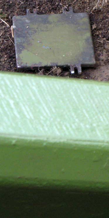 Краска пока свежая (не высохла) так что чуть светлее и ярче, чем образец (на заднем плане крышка с очищеным уголком внгизу слева). По высыхании краска потемнеет и посереет, так что будет не отличить.