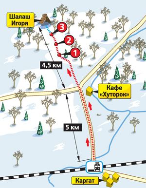 Путь Грудцинова, по которому прошел наш журналист. (1) Здесь автор репортажа не выдержал и сел в редакционную машину погреться. (2) Место, где застряла машина. (3) Здесь Александр повернул назад, потому что реально испугался, что не хватит сил вернуться.