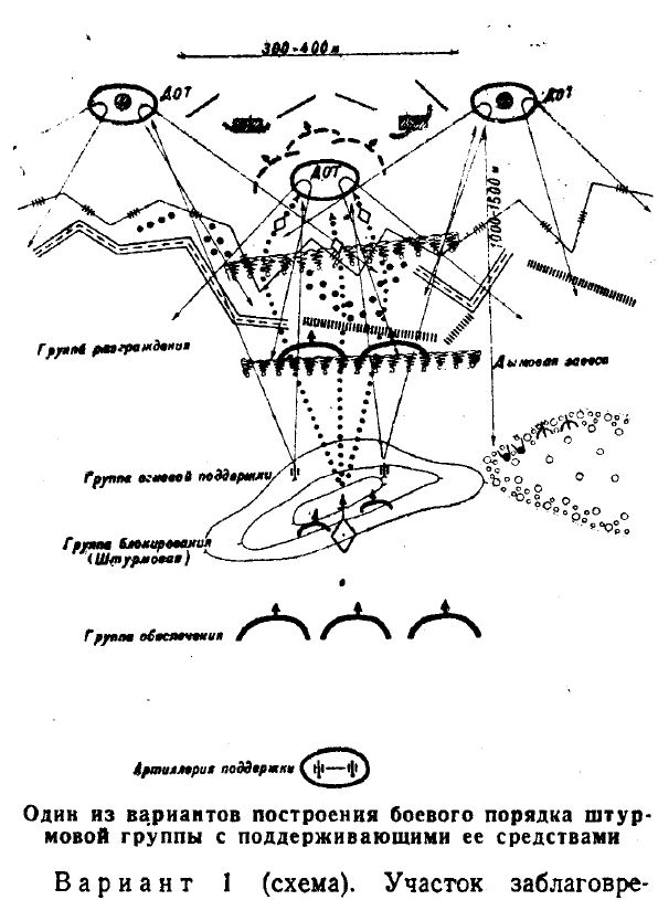 А к 1944 году были уже выпущены наставления, например: "Действия танков штурмовой группе при атаке дот", в которых подробно описывались действия штурмовой группы