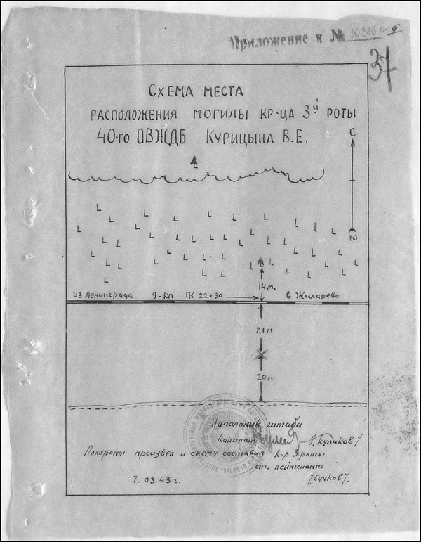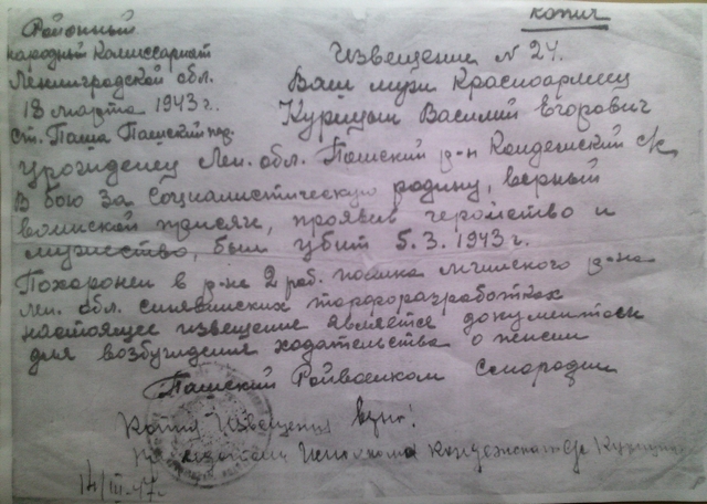 Курицин Василий Егорович погиб 5.03.43, первоначальное место захоронения: РП № 6, перезахоронен (но не увековечен):