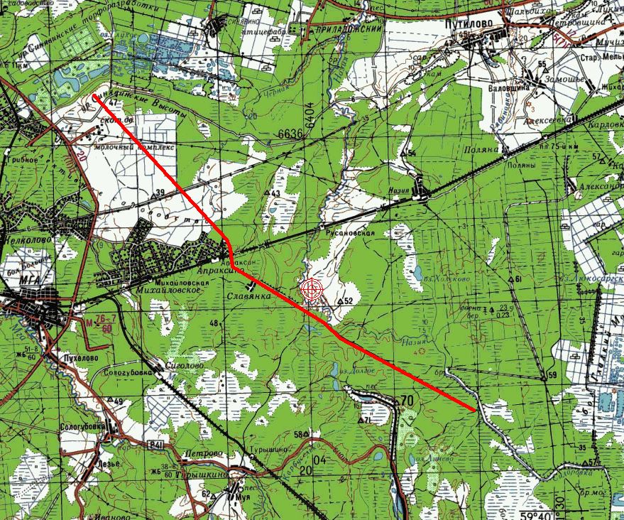 На довоенных картах обнаружил трассу, очень похожую на железнодорожную, прослеживаемую на обозначенном отрезке.