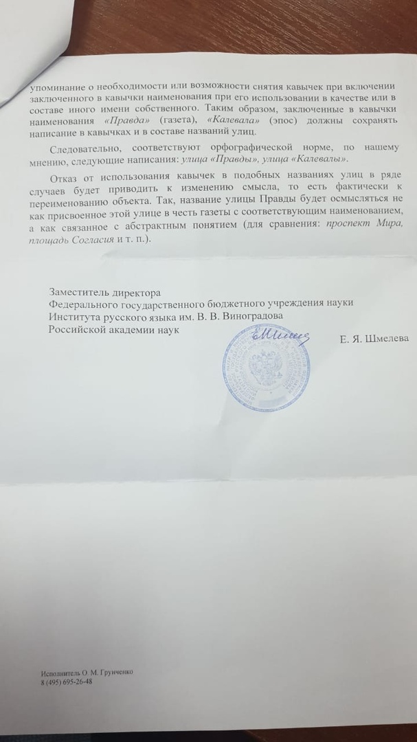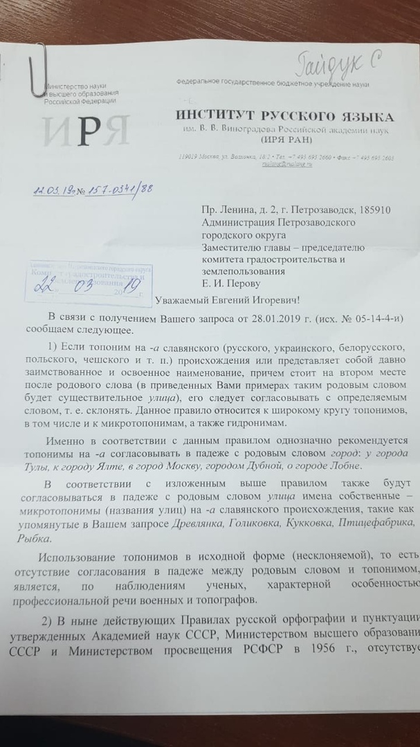 Пришёл ответ от Института русского языка РАН по поводу склонений наименований улиц - Древлянка, Кукковка, Рыбка, Голиковка, Птицефабрика, а также по поводу кавычек в наименованиях улиц "Правды" и "Калевала".