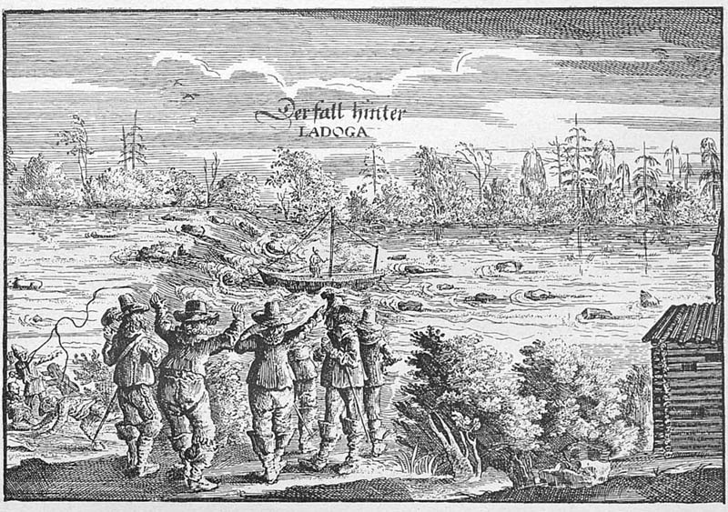 Логично предположить, что Олеарий во время своего путешествия попал как раз в одну из "многоводных фаз" Ладожского озера. Правда, колебания Ладоги не покрывают высоту каньона Лавы, но во времена Олеария каньон мог начинаться ниже по течению, чем сейчас, а переправа у острожка попадала на обычное (в смысле без каньона) русло Лавы. За эти несколько сотен лет каньон мог "продвинуться" выше по течению метров на 300-400.