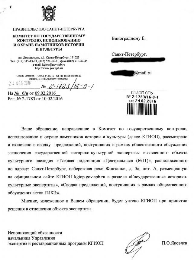 Ответ из КГИОП по объекту "Тяговая подстанция «Центральная" (№11)». Все обращения