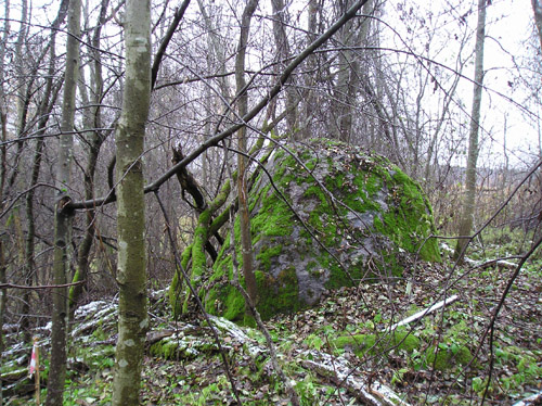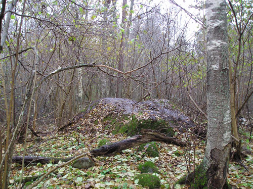 Этот камень был найден А.Оличевым еще прошлой зимой, но подробно обследовать его удалось только осенью. Валун имеет практически вертикальные стенки, на его вершине есть одно чашечное углубление (интересно как на него залезали те, кто его сделал?), но главными его особенностями являются расположение на самом краю террасы (из-за чего высота камня варьируется, в зависимости от стороны, от 1.8 до 2.7м.) и наличие рядом примыкающей к валуну каменной кладки и ямы, возможно старинного раскопа (?).