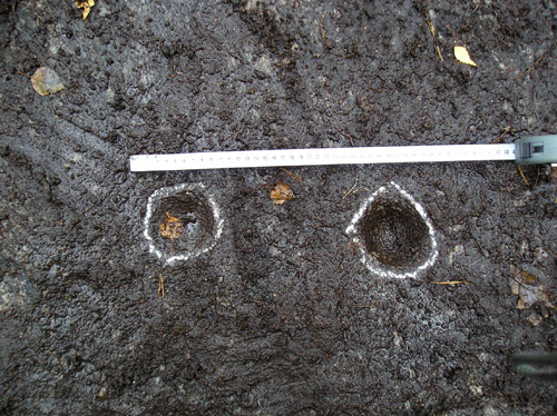 Общий вид "двухчашечного" валуна, к которому также примыкает каменная выкладка. Особенностью валуна является сложный рельеф верхней плоскости и компактная группа из 2х чашек на вершине камня.