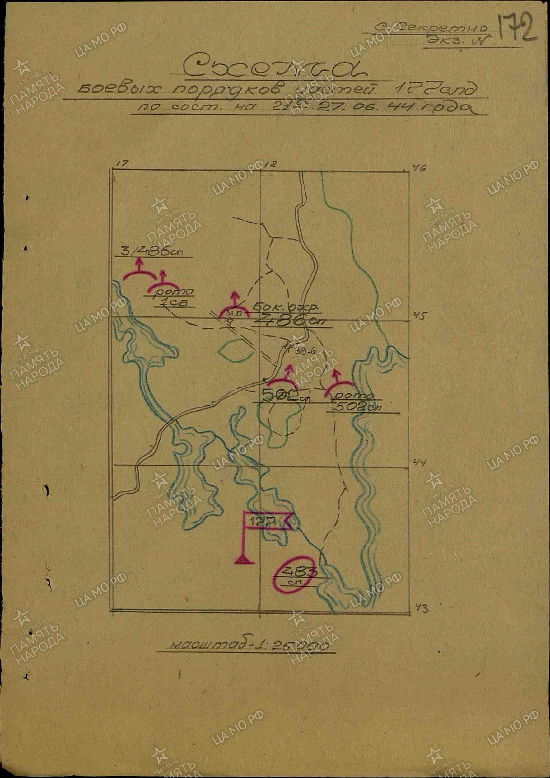 На сайте "Память народа" есть ЖБД 177й СД на июнь месяц. Ее положение можно проследить по дням. СД 20.06 форсирует Салменкайту, 21.06 сосредотачивается в р-не Хейниоки и поступают в подчинение командира 6 СК. Дальше они двигаются на север. Положение на 27.06 (стр. 20):