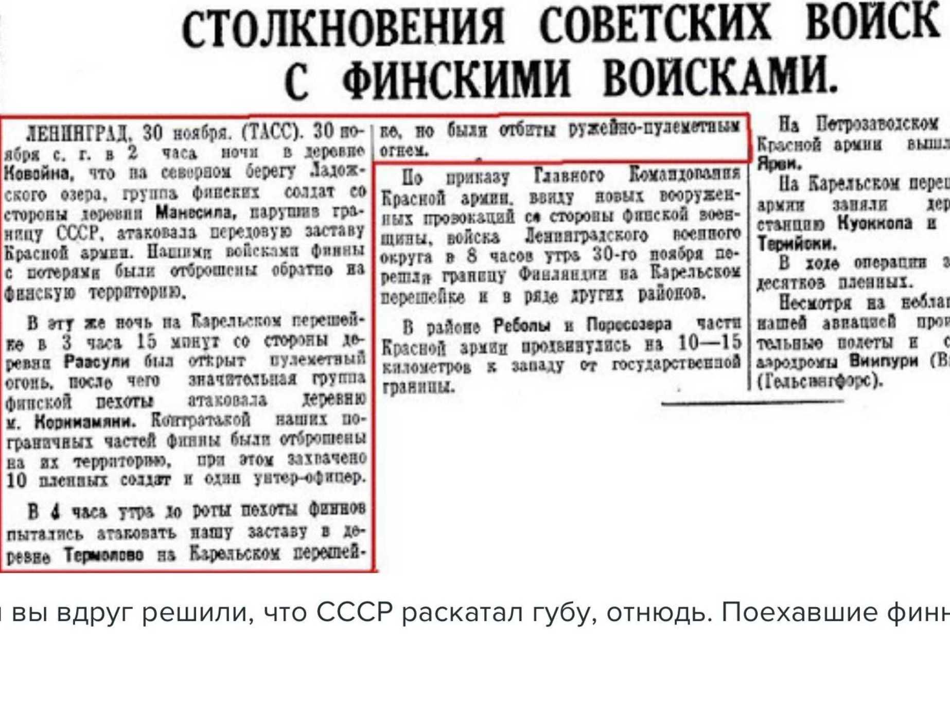 Вообще-то,при определении даты начала войны неправильно упускать из виду Майнильский инцидент,организованный финской военщиной.Именно сразу после этого события командующий ЛВО т.Мерецков доложил в НКО,что "в ряде мест имели место проникновения финских диверсионных отрядов на советскую территорию".Так кто и когда начал?Вот,пожалуйста,ещё свидетельство: что оставалось делать руководителям советского правительства,чтобы обуздать наглых провокаторов-поджигателей войны,как не отдать приказ о наступлении в 8:00 30 ноября 1939 года?
