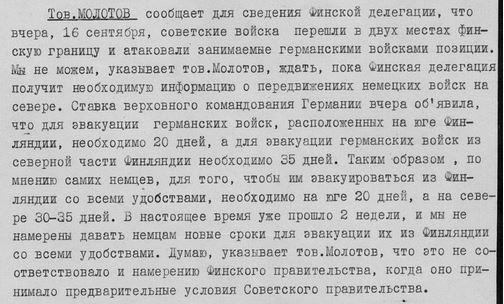 Ввиду того, что финское правительство удовлетворило требования советского правительства о разрыве отношений с Германией и о разоружении немецких войск, Ставка Верховного Главнокомандования приказывает: