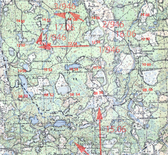 В ночь на 18.06 противник стремительно отрывается и на следующий день 946 СП наступает уже севернее Рауту на Петяярви.