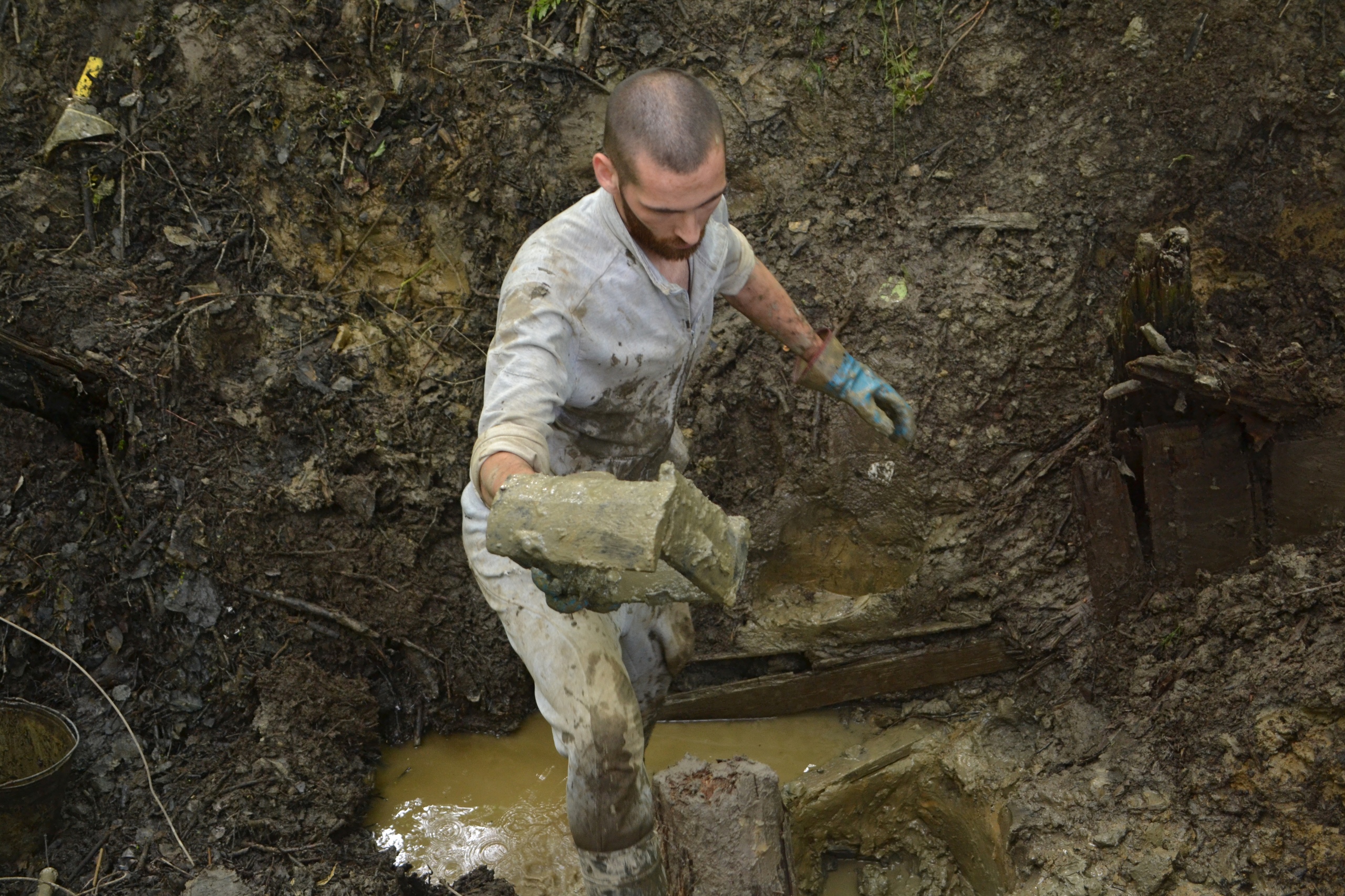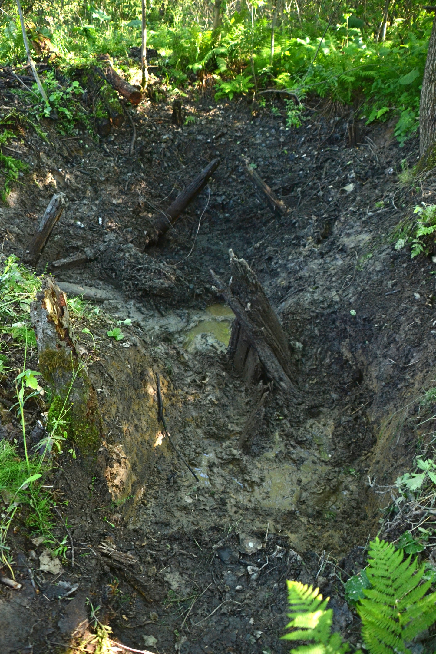 А затем наша небольшая команда разделилась. Часть занималась настилом и обшивкой траншеи, а другая часть - землянкой. В землянке найдена обшивка входа, сделан шурф до досок пола. Шурф потом можно будет использовать для откачки воды - вода поступает постоянно, ее дважды откачивали помпой и несколько раз вычерпывали ведрами.