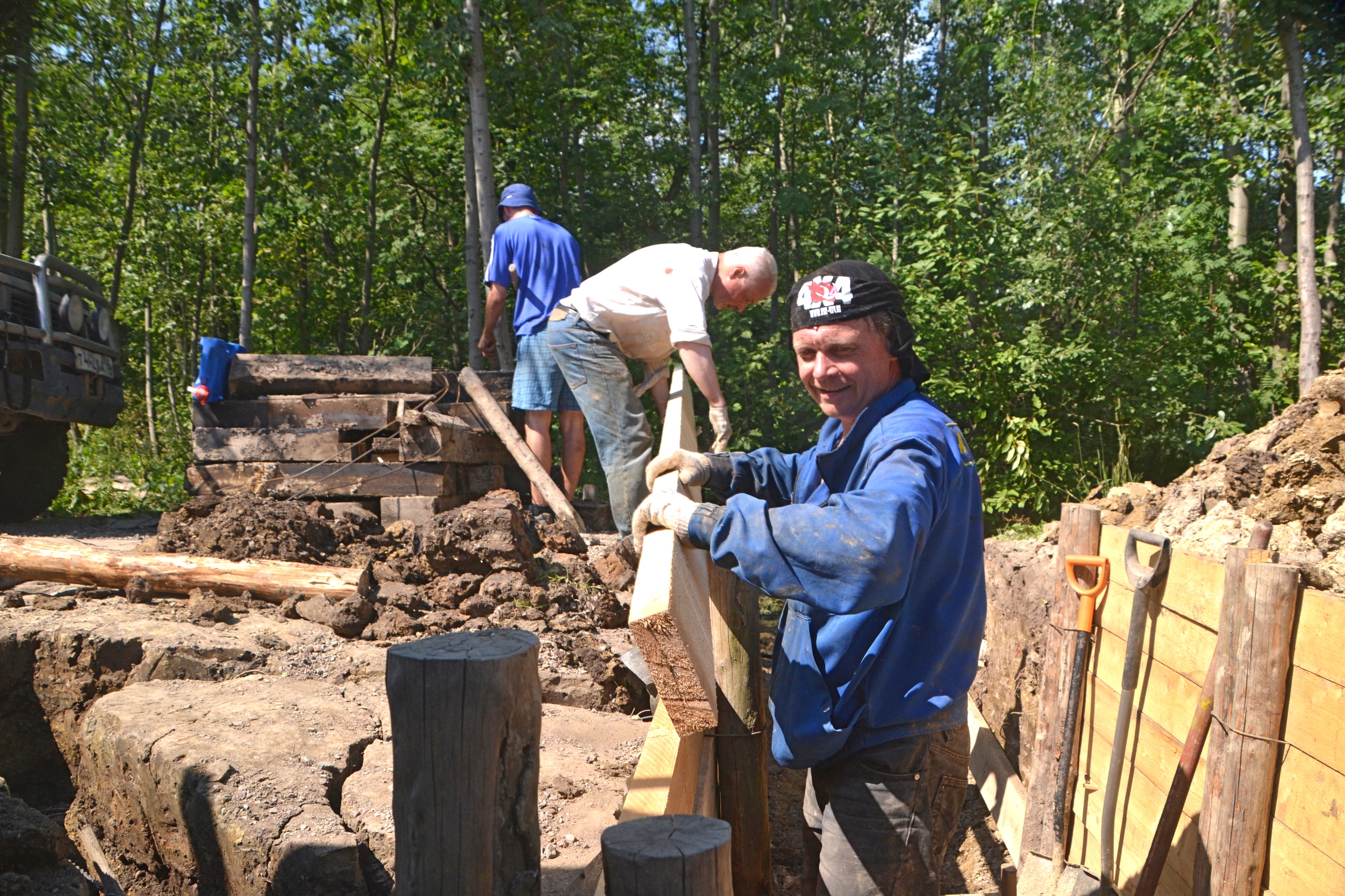 "Жара была, жара плыла", но работы у дота не останавливаются. Сделан ремонт секции обшивки траншеи жердями и обшит досками новый участок:
